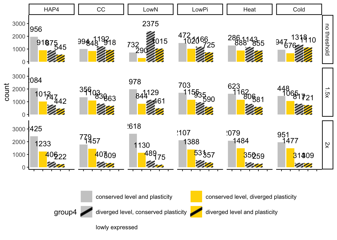 Creating mutually exclusive sets of genes based on level and plasticity divergence in parents each gene is a combination of its level category and its plasticity category ## level categories: 1) conserved: parent padj >= p_thresh 2) diverged: parent padj < p_thresh, not taking into account hybrid yet ## plasticity categories (just looking at parents): 1) conserved: 11, 22, 00 2) diverged: 12, 21, 01, 10, 02, 20